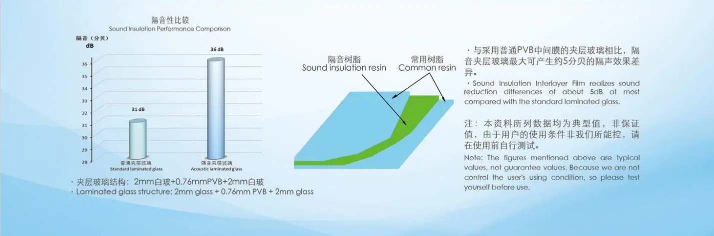 Product Introduction:HT-S series is specially designed for sound insulation interlayer film.lt has anexcellent damping function for sound waves, which makes it extremely effective insuppressing the propagation of noise, thus ensuring the automotive or indoor environments are more comfortable. HT-S series sound insulation interlayer film, through the co-extrusion technology, adds a sound insulation core layer on the basis of the original interlayer film. The sound insulation. Compared with the standard interlayer film, the sound insulation interlayer film can improve the sound insulation performance by about 5 dB, which is the most sensitive sound frequency (1,000-4,000)Hz of the human ear.